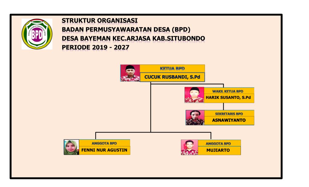 Kemudian setelah tahun 2013 (September) Desa Bayeman dipimpin oleh seorang Kepala Desa perempuan yang bernama AGUSTINI RAHAYU melalui proses PILKADES dengan PESERTA 3 Pasang Calon. dan kepemimpinan AGUSTINI RAHAYU berlangsung hingga Berakhir di Tahun 2019 sebagai Akhir dari periodenya.